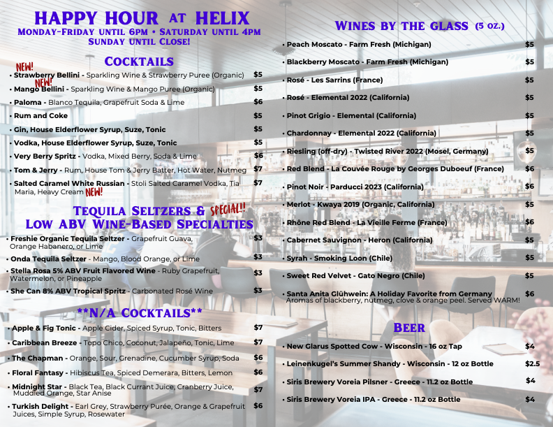 We feature a careful curation of wine, beer, craft cocktails, almost 400 spirits, Peet’s coffee and delicious appetizers, hearty shareables, soups, sandwiches, boards, and desserts that deliver exceptional quality for the price. We have also added a delicious Sunday Brunch to our many amazing offerings! No matter your budget, Helix strives to deliver an amazing food & drinks experience from Open to Close. And check out our Happy Hour Drinks Specials every Sunday through Friday from Open until 6pm! (photo courtesy of @Brooklynn_creations)